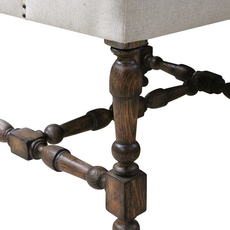 Weathered pine with light gray wash, spanish style carvings in solid hardwood, tailored in creamy alabaster linen with subtle slubbing and antique bronze accent nails. Seat height is 21".