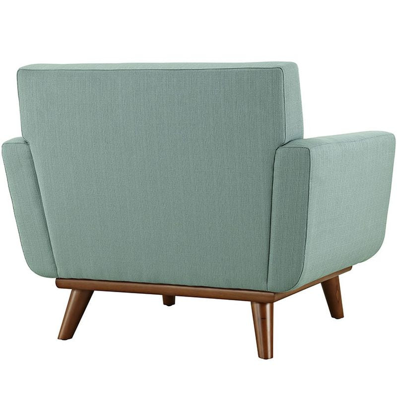 Gently sloping curves and plush seat cushion create a favorite lounging spot. Whether plopping down after a long day at work, settling in with coffee and brunch, or entering a spirited discussion with friends, the Engage armchair is a welcome presence in your home. Three tufted buttons create eye catching appeal; adding depth that brings your sitting decor to center stage. Four cherry color rubber wood legs and frame supply a solid base to the comfortable upholstered material.