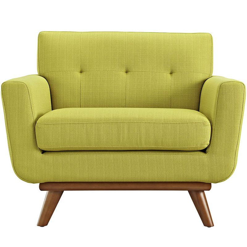 Gently sloping curves and plush seat cushion create a favorite lounging spot. Whether plopping down after a long day at work, settling in with coffee and brunch, or entering a spirited discussion with friends, the Engage armchair is a welcome presence in your home. Three tufted buttons create eye catching appeal; adding depth that brings your sitting decor to center stage. Four cherry color rubber wood legs and frame supply a solid base to the comfortable upholstered material.