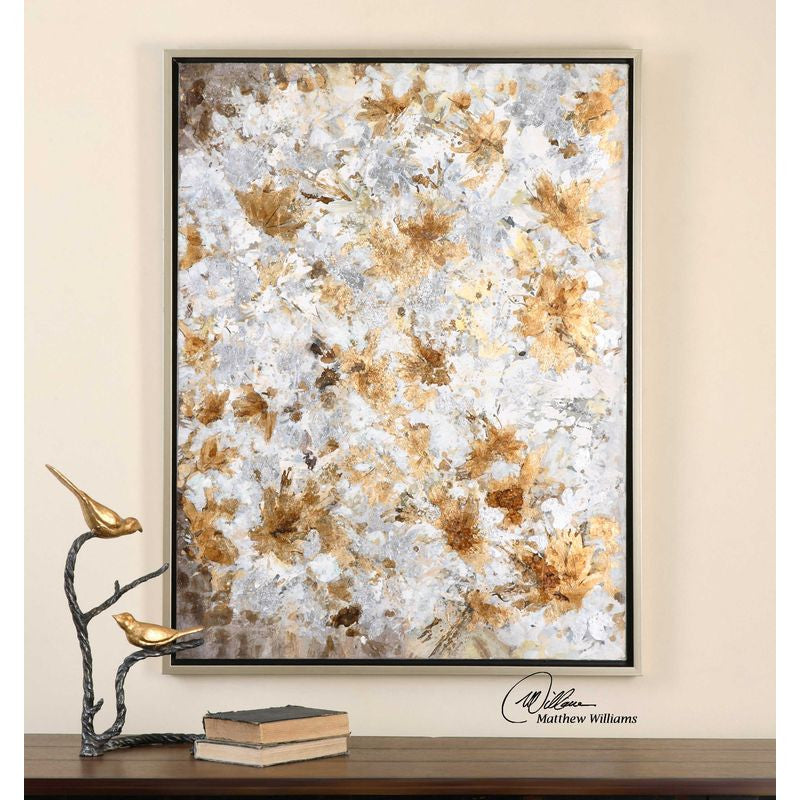 Hand painted artwork on canvas accented by a silver frame. Due to the handcrafted nature of this artwork, each piece may have subtle differences.