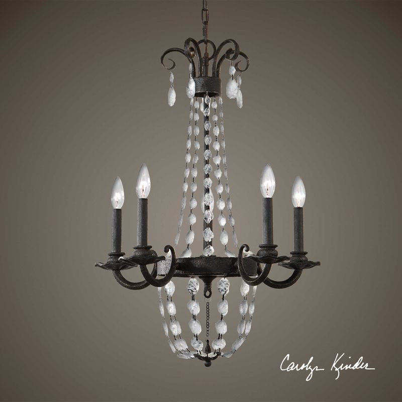 The rough textured black finish along with the jewelry chain ice chunk accents lend a feeling of fire & ice to this traditionally shaped chandelier, giving a casual yet uptown effect.