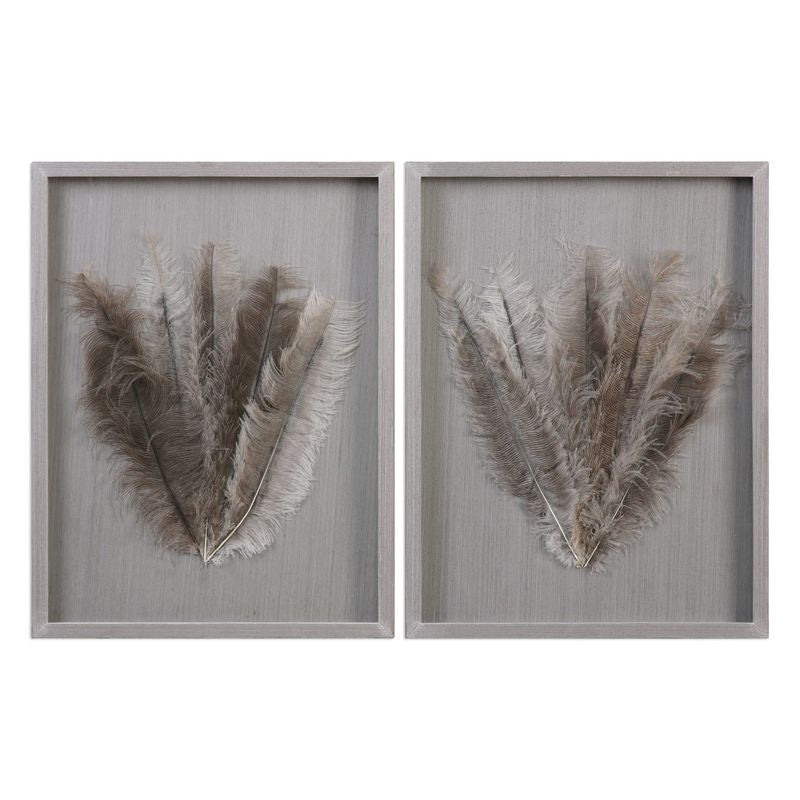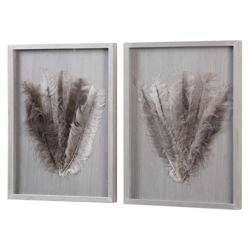 Lush, authentic ostrich feathers in natural hues mounted under glass in a pine wood shadow box, with veneer overlay. Veneer grain pattern and feather tones may vary slightly.