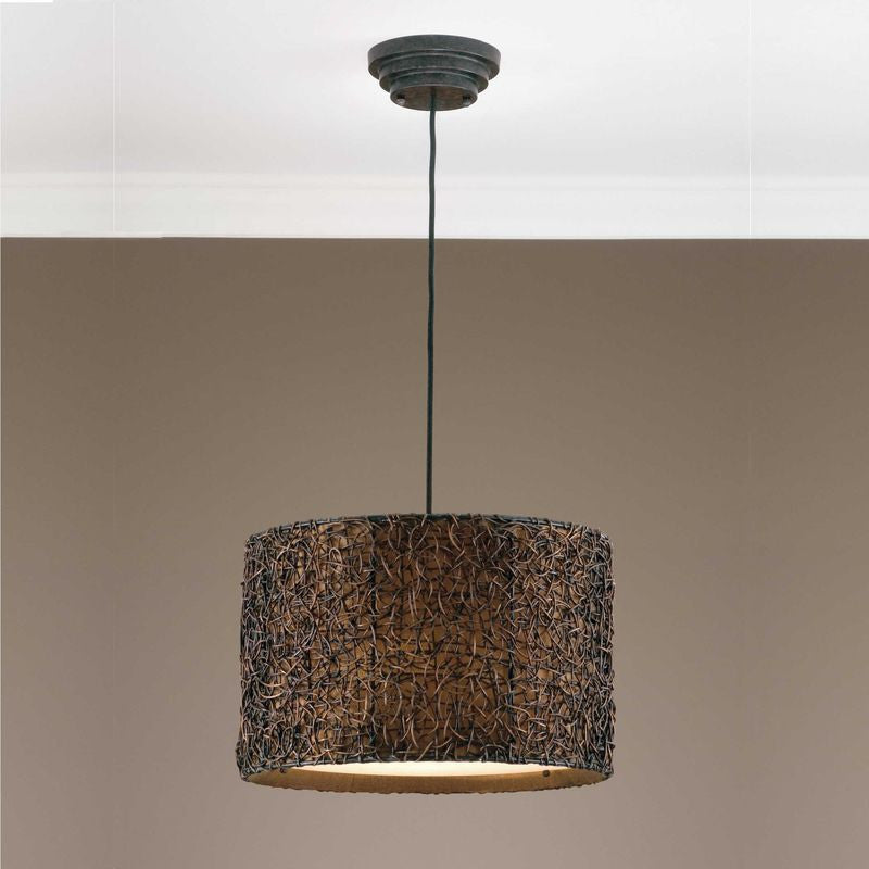 Hand rubbed espresso finish with metallic bronze fabric liner and a frosted diffuser.