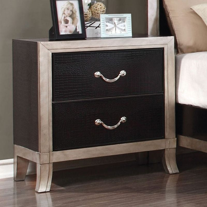 Contrast defines this elegant night stand: flowing lines are set against straight edges, while the smooth silver finish clashes beautifully with the textured, crocodile leatherette front panels. Legs curve gently outward away from the straight frame, while antique-looking handles exhibit curves as well. - Contemporary Style - Crocodile Skin Textured Panel Accents - Case Goods With Metal Handles - Solid Wood, Wood Veneer, Others - Silver Finish