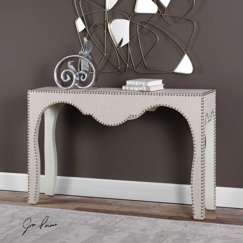 Smooth curves accentuate the classic details of antique bronze nail head trim over beige linen fabric cladding.