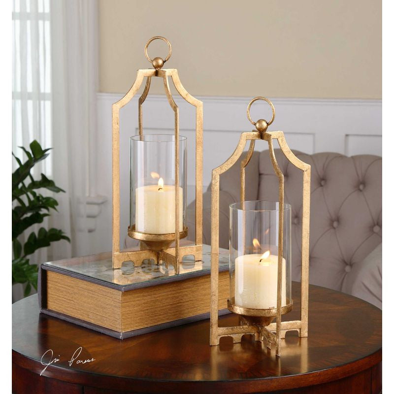 Bright, metallic gold metal with clear glass globes and distressed white candles.