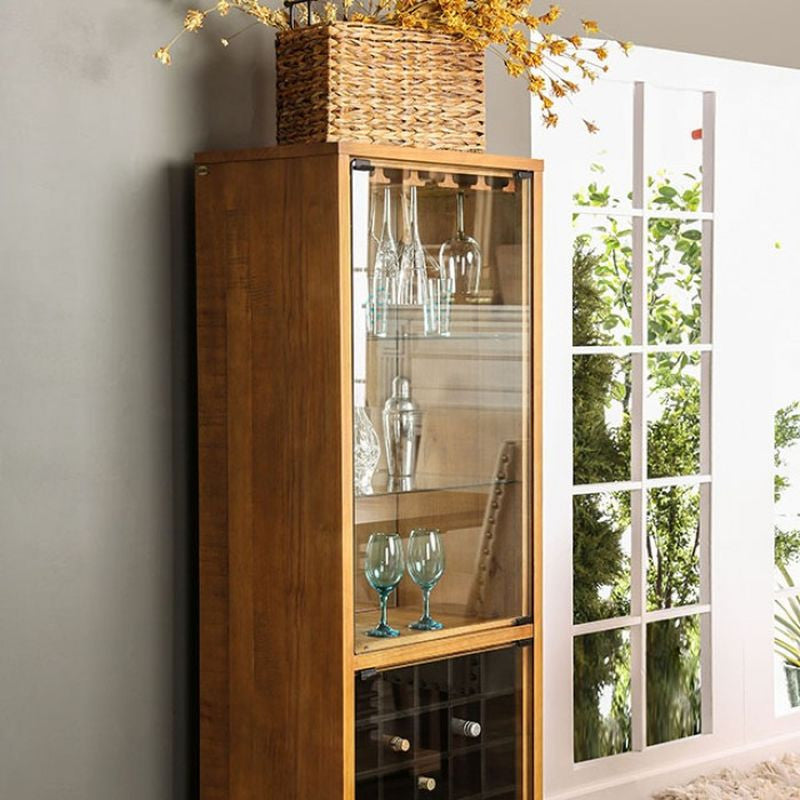 Celebrate the most festive occasions with this wine cabinet. This oak finish cabinet offers more than just storage for unused china and silver; it also holds wine bottles for your very own special cocktail party. - Transitional Style - Wine Cabinet - Oak Finish