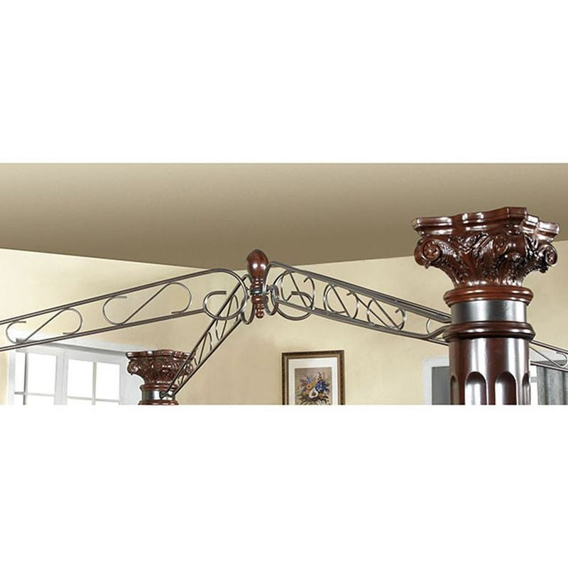 Add luxury to your home with this baroque styled bedroom suite. The four posts bed has an intricate steel canopy with button tufted leatherette headboard and footboard. The same design features accent matching night stand, chest and dresser and mirror. Finished in a warm two toned brown cherry finish. - Luxurious Baroque Style - Poster Canopy - Padded Leatherette H/B & F/B - Solid Wood, Wood Veneer, Others - Brown Cherry Finish