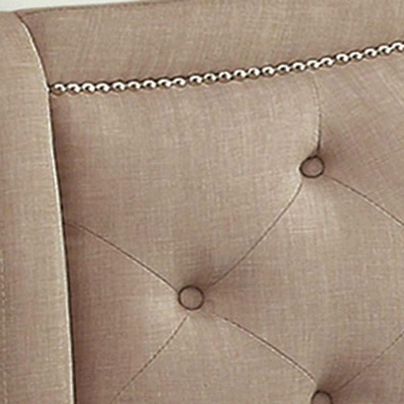 Fully upholstered in taupe fabric, this elegant bed features a camelback shaped padded headboard with nailhead trim. Button-tufting create a visually plush facet for the semi-wingback headboard. The contrasting case goods showcasing a unique tiered design are finished in es presso. - Contemporary Style - Padded Fabric Bed - Camel-Back Shape H/B - Solid Wood, Others - Taupe Color