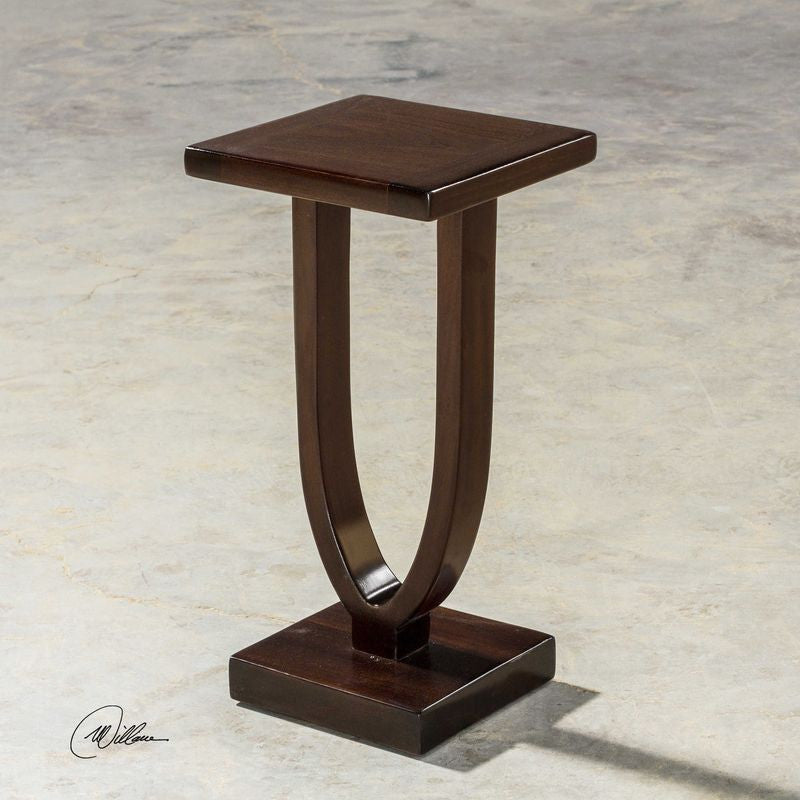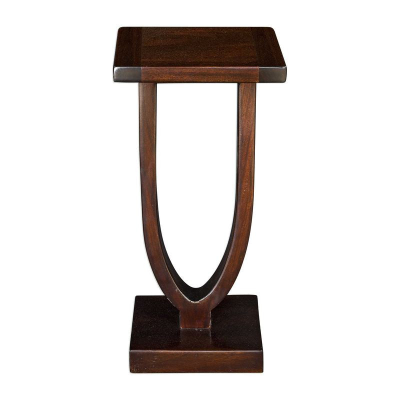 Artistically carved from solid mahogany in a clean hickory finish, the sweeping curves and demure scale of this occasional table embody quality build and traditional elegance.