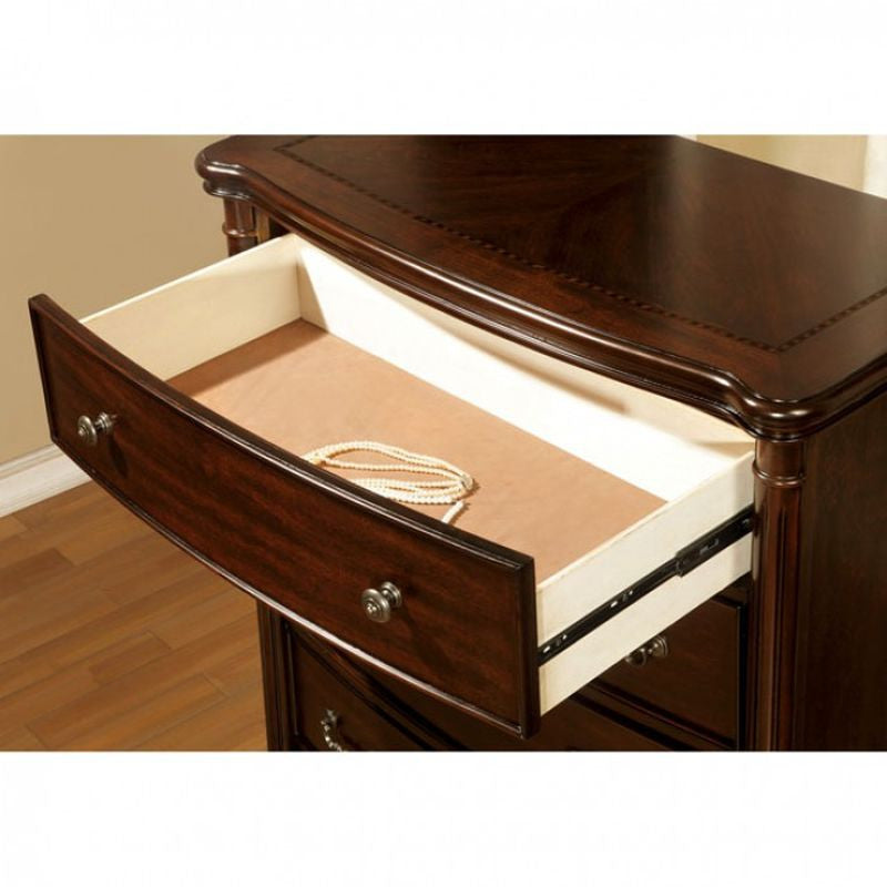 Make it grand. Bring a royal air to your bedroom with elegant, classic frame detailing & antique-inspired carvings. From the intricate metal carving accenting the bed - Transitional Style - Metal Accented Headboard - Full Extension Drawers - Felt-Lined Top Drawers - Solid Wood, Wood Veneer & Others - Dark Cherry Finish