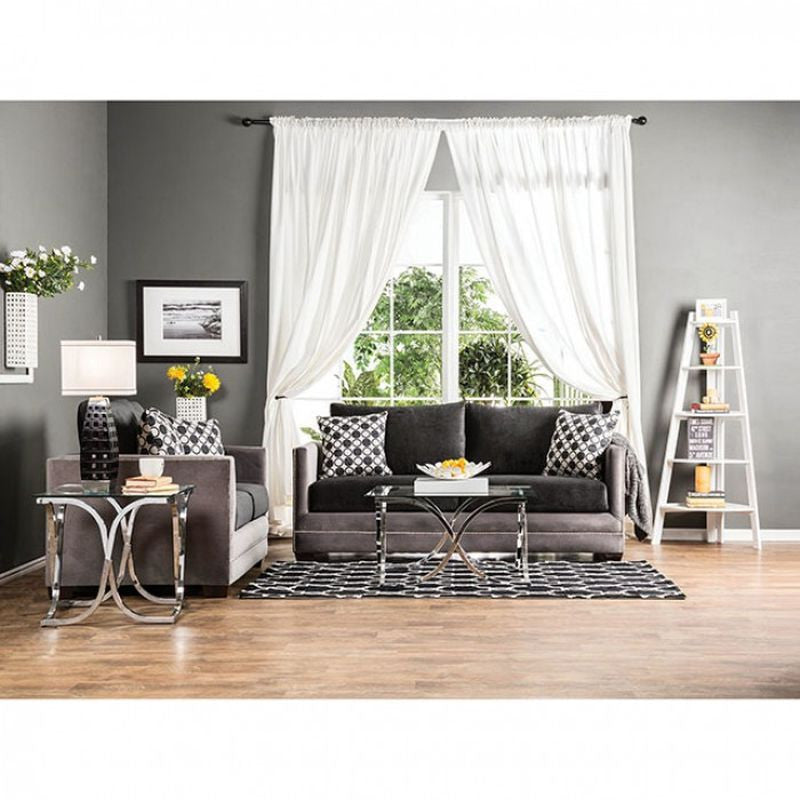 Casually chic, this sofa set will look perfect in any setting. Relax upon its premium fabric upholstery and enjoy the luxe softness of the fitted back pillows. With beautiful nailhead trim and a stylish two-tone coloring, this set is the missing addition to your home. - Contemporary Style - Track Arms w/ Nailhead Trim - Fitted Back Pillows - High-Density Foam Cushions - Pillows Included - Two-Tone Black & Gray - Premium Fabric - US-Made (Incl. Foreign Materials)