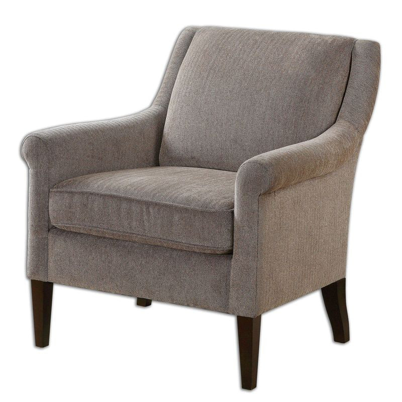 Sleek silhouette of trim, roll arms with a well-padded tight back, and comfortable, welted box cushion. Soft herringbone fabric in creamy beige against dark walnut, tapered hardwood legs. Seat height is 21".