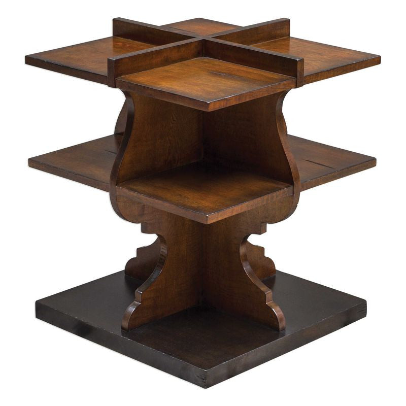 Handcrafted of plantation grown mango wood with Welsh inspired lines, in a warm honey finish and base in worn black. The tri-level design offers numerous display areas.