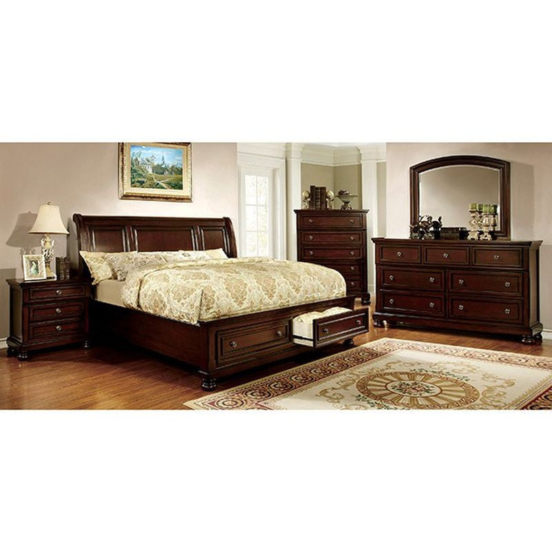 This stylish bedroom set features a gorgeous platform bed with storage drawers. The rich dark cherry finish adds a natural appeal. This stylish bed features a rich dark cherry finish and slightly curved headboard. The matching night stand provides USB and power outlet on the top drawer for convenience. - Transitional Style - Storage Platform Bed w/ 2 Footboard Drawers - Curved Headboard - Night Stand w/ USB Outlet & Hidden Drawer - Solid Wood, Wood Veneer & Others - Dark Cherry Finish