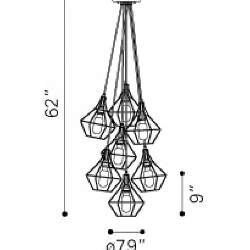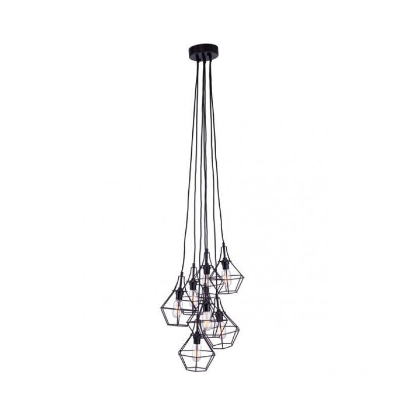 Palmerston Ceiling lamp has 7 unique pendants clustered in a stagger pattern, hung by slim black cords. Each pendant has a frame work in a jeweled shape with distressed black finish metal enclosed around oblong Edison style bulbs. Glamorous or rustic, this splendid ceiling fixture will add dimension to any room regardless of the application. Bulbs not included, Matt Watt 25 W E26 Type T45 Edison. UL approved and listed.