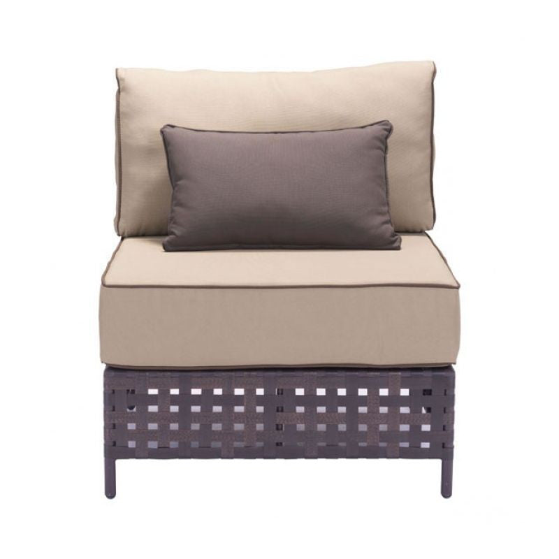 The Pinery collection features a stunning copper basket pattern synthetic weave covering a galvanized aluminum frame for a distinctive design statement. Pinery Middle chair features plush cushions is Sunproof acrylic dyed solution with open weave to foam & fill cushions;  avoiding moisture buildup. Sold separately, the collection includes dining table & chair; and entire lounge series featuring armchair, sofa, corner, middle, chaise, coffee table and ottoman.