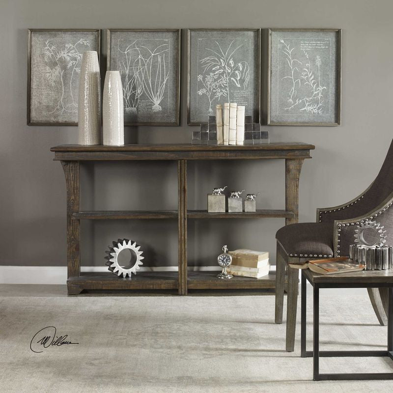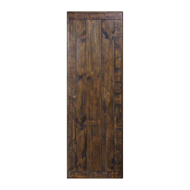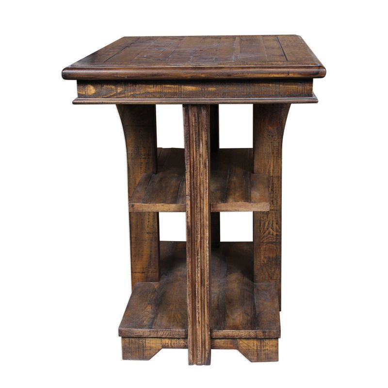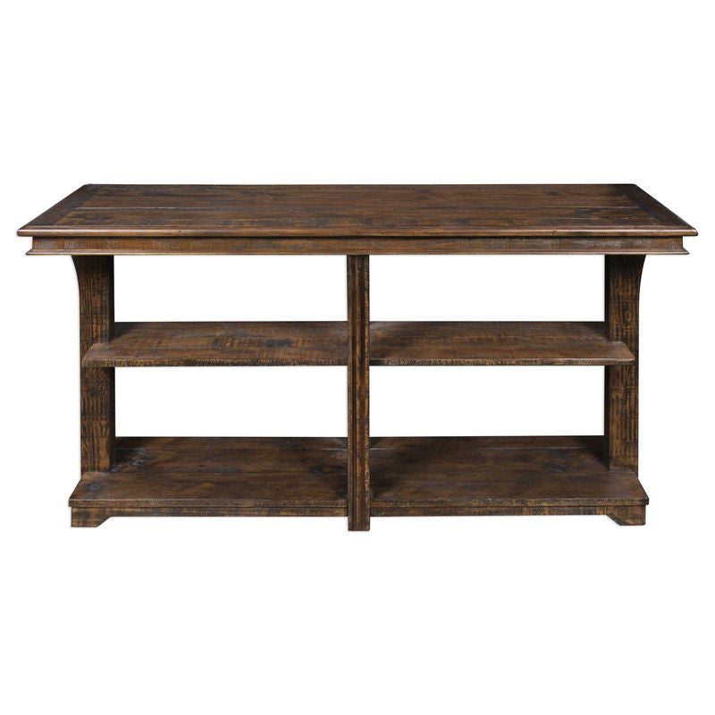 Handcrafted from solid pine in a tri-level design with ribbed legs, finished in a warm chocolate brown glaze with honey undertones.