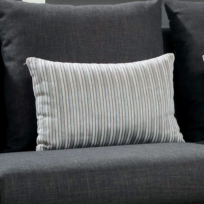 A great addition to any modern home, this sectional will bring sophistication to the living room. Two contrasting fabrics are used in the seat and pillows, while the frame is upholstered in black leatherette. - Contemporary Style - Pillows Included - Fabric & Leatherette - Charcoal & Black