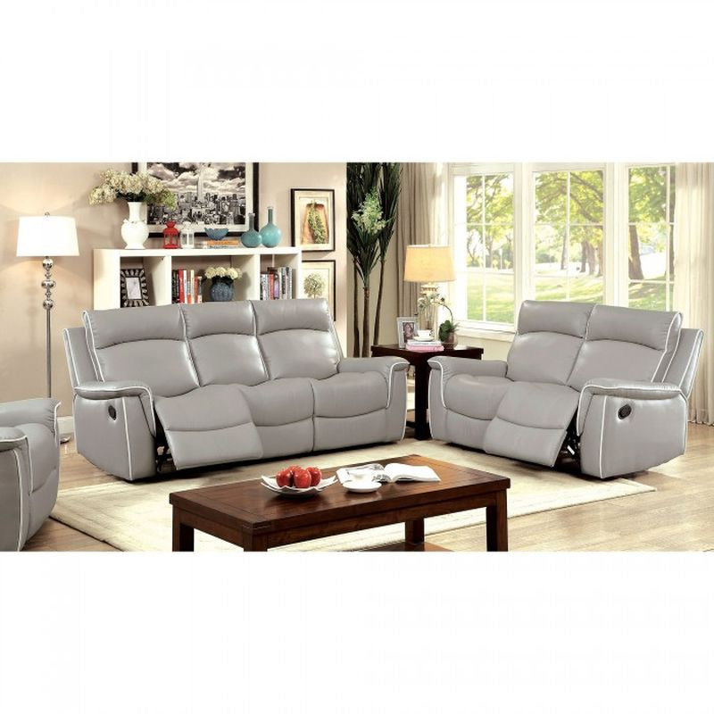 Relax in style with this updated sofa collection. The smooth leatherette upholstery features a gorgeous neutral gray coloring while contrasting welt trim in white emphasizes the sleek lines. Bucket cushions gently curve and support, providing a stylish seating design for the reclining seats. - Contemporary Style - Plush Cushions - Leatherette - Recliner - Contrasting Welt - Light Gray