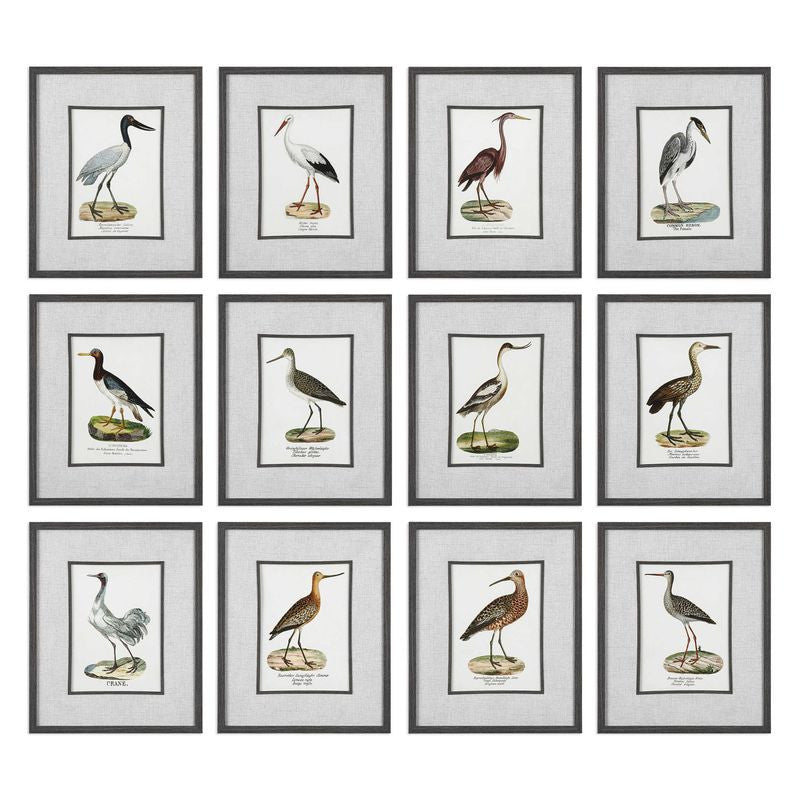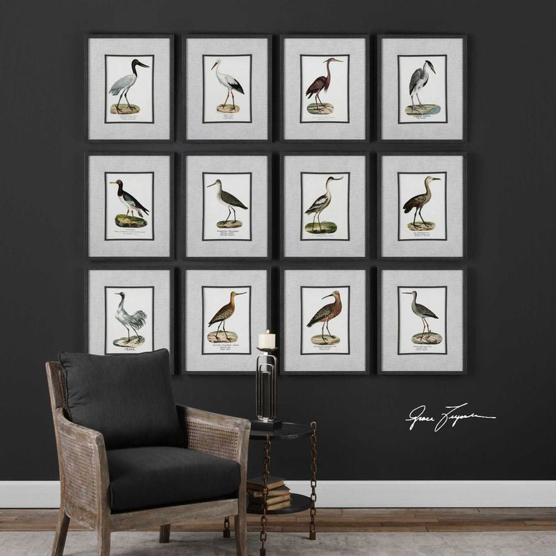 This array of bird prints is accented with gray linen mats featuring satin black fillets around the inner edges. Prints are under glass and encased by narrow, satin black frames.
