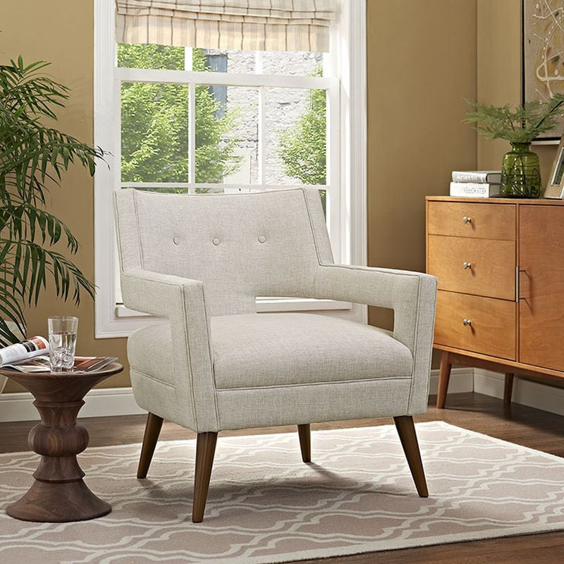 Minimalist lines reveal much with the Sheer Armchair. Playing off mid-century form, Sheer combines iconic design elements with an inspired sleek shape that makes it easy to relax and enjoy some leisure time. Imbue your living or lounge area with this unique piece made of dense foam padding, fine polyester upholstery, and cherry stained wood legs. Sheer works well in vintage, cabin, contemporary, global, and other eclectic spaces.