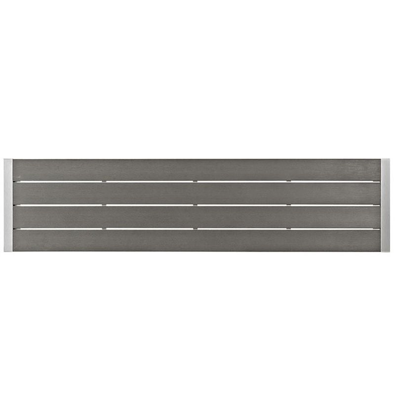 Enjoy your patio or backyard leisure time with the strong and durable Shore Outdoor Bench. Made with an anodized brushed aluminum frame and non-marking black plastic foot caps, Shore features tone-on-tone grays with wood accents on the paneling for a chic and minimalist look. The Shore Outdoor Bench complements your casual gatherings with a look and functionality that you can rely on.