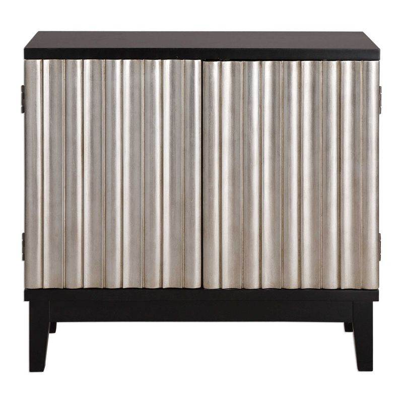 Hand carved doors finished in champagne silver leaf, with ebony stained legs and top. Three adjustable shelves inside.