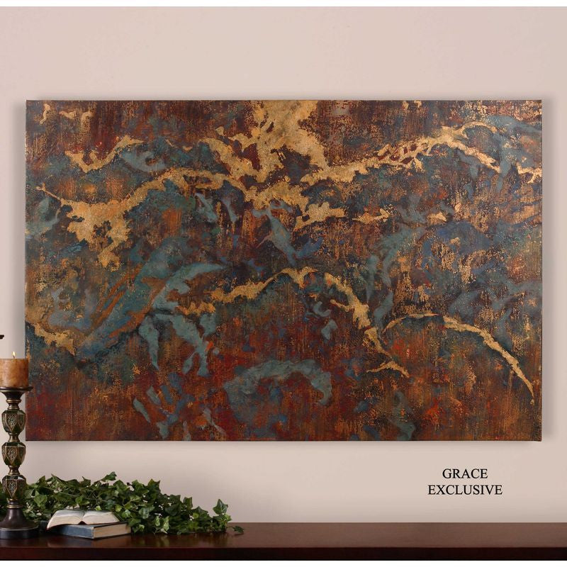 This frameless, hand painted oil on canvas is stretched and attached to wood stretching bars. Due to the handcrafted nature of this artwork, each piece may have subtle differences. May be hung horizontal or vertical.