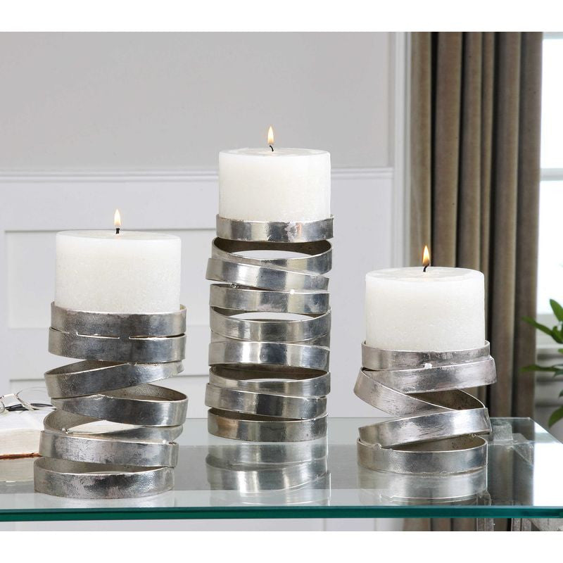 Abstract in design, these candleholders feature a metallic silver finish. Distressed white candles included. Sizes: sm-5x4x5, med-5x6x5, lg-5x8x5.