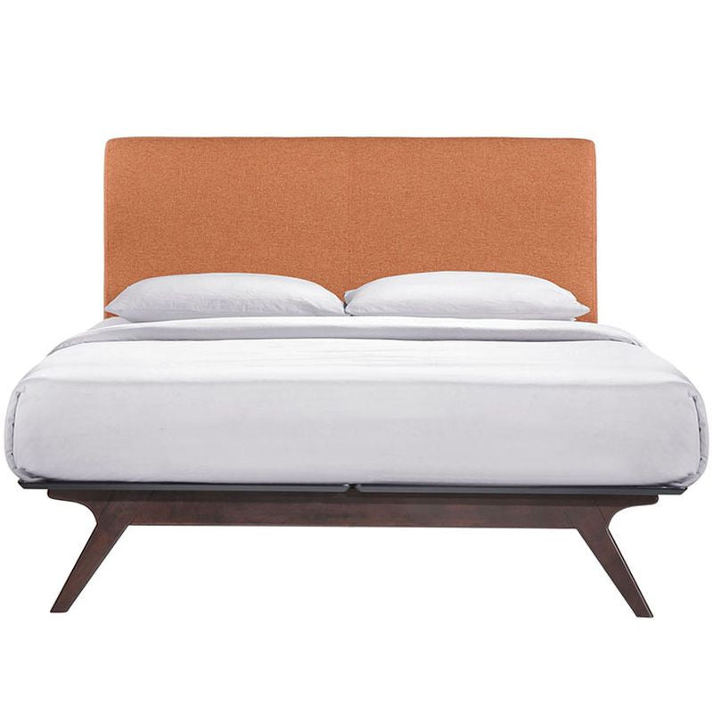 Transform your ordinary bedroom arrangements into a more compelling décor with the Tracy bedroom set. The Tracy bed with its open design and platform leg support, proves that elegance doesn’t need to come at the expense of simplicity. Finely upholstered with a foam padded fabric headboard, Tracy is an easy to maintain toffee brown stained piece that admirably delivers both comfort and style. Tracy requires assembly, and should be spot cleaned only. Headboard included. Queen size mattress not included. The Tracy queen size platform bed does not need a boxspring.