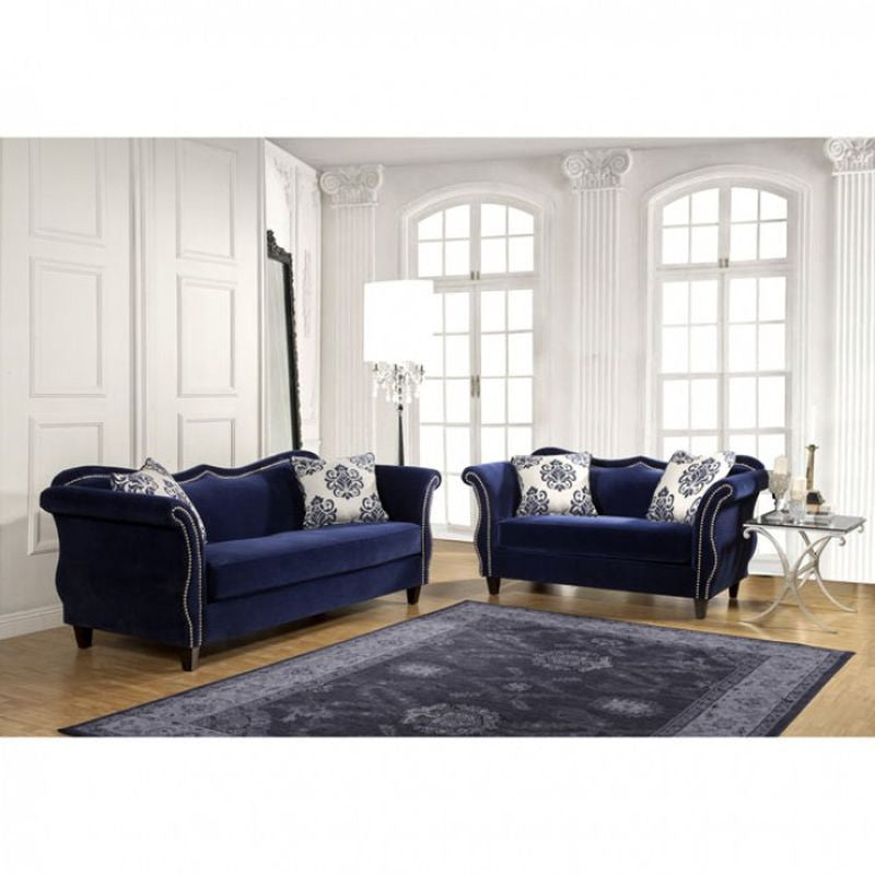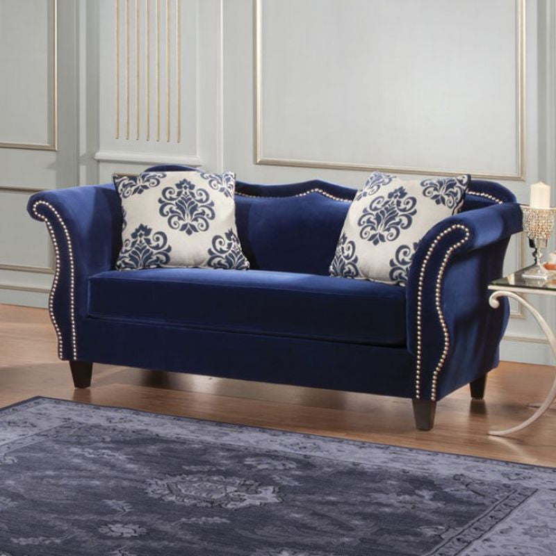 Glamourous, modern elegance with a touch of tradition is what this sofa collection is all about! A very trim take on a classic English-arm sofa, featuring curved pleated arms, and a single row of nailhead trim across the back and front of arms. Elegant and modern sofa with a comfortable yet stylish slender bench seat stands gracefully on tall tapered wooden legs. - Modern Victorian Style - Bench Style Seat - Sweetheart Style Back - Nailhead Trim - High-Density Foam Cushions - Royal Blue - US-Made (Incl. Foreign Materials)